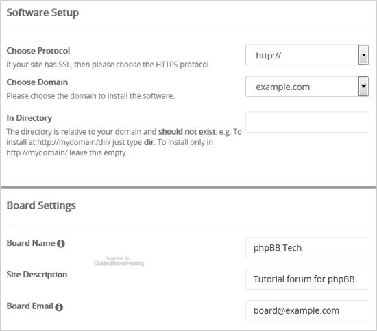 - In Directory: If you want to install this in a directory, for example example.com/forums, enter the directory name. Otherwise, leave this blank to install in your main domain example.com