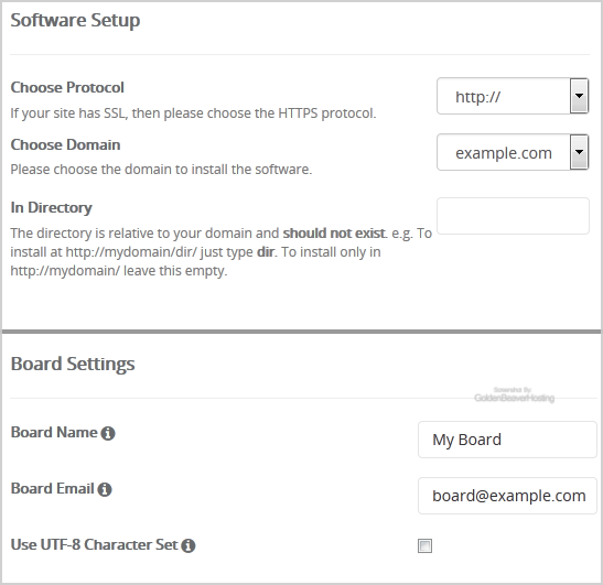 • In Directory: If you want to install this in a directory, for example example.com/forum, enter the directory name. Otherwise, leave this blank to install in your main domain example.com