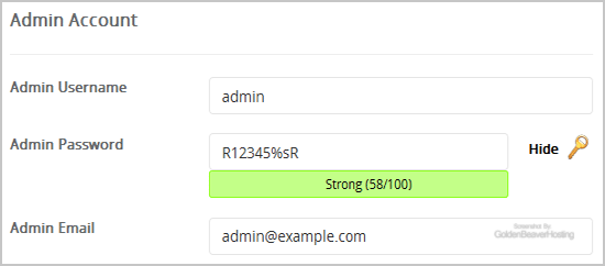 - Admin Username: Your new Subrion username (for security reason do not use the "Administrator" or the "Admin" username.)