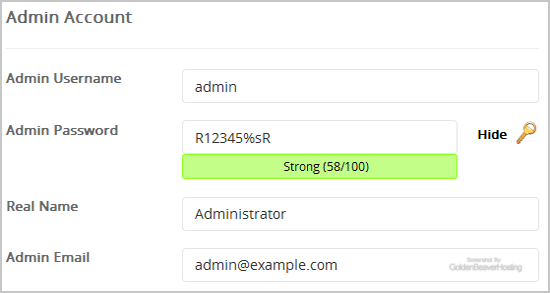 9. Under the "Admin Account" field enter the following information: